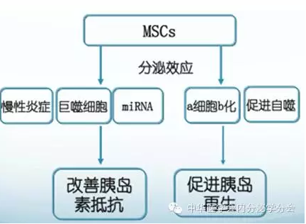 眾所周知,1型糖尿病是由胰島β細胞自身免疫炎癥所導(dǎo)致的β細胞破壞,而2型糖尿病則是胰島β細胞功能受損及胰島素抵抗共同作用的結(jié)果。因而,理想的治愈糖尿病的策略,必然要針對上述關(guān)鍵環(huán)節(jié)。母教授團隊的研究顯示,MSC同時具備上述兩方面的作用:通過其分泌效應(yīng),減輕慢性炎癥,促進巨噬細胞向抗炎M2型巨噬細胞轉(zhuǎn)變,通過外泌體中的miRNA減輕胰島素抵抗;促進b細胞自噬,促進alpha細胞向beta細胞轉(zhuǎn)變保護b細胞,促進b細胞再生。兩方面共同作用下,產(chǎn)生降糖效應(yīng)。