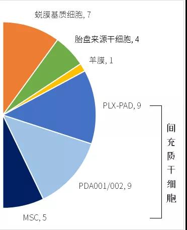 從細胞來源來看,66%(23項)為間充質(zhì)干細胞;20%(7項)為蛻膜基質(zhì)細胞;11%(4項)登記為胎盤來源干細胞,其中2項是聯(lián)合臍帶血造血干細胞應用。