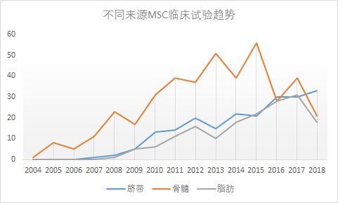 從趨勢來看,骨髓和脂肪相關(guān)研究在2016-2018出現(xiàn)下降,而臍帶相關(guān)研究持續(xù)增長。