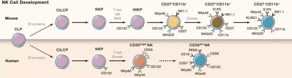 在小鼠中,共同淋巴樣祖細胞產(chǎn)生共同ILC前體(Common ILC precursor, CILCP)。而CILCP可產(chǎn)生NK細胞、輔助樣ILCs。從CILCP開始,機體內(nèi)的NK細胞發(fā)育至少包括五個階段才可產(chǎn)生NK細胞,即:
