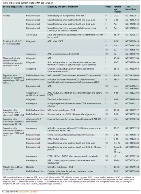 NK細胞療法被廣泛用于各種癌癥的治療,包括:血液系統(tǒng)腫瘤、神經(jīng)母細胞瘤、卵巢腫瘤、橫紋肌肉瘤、乳腺癌、胃癌等等,在這些研究中,都取得了不錯的治療效果,包括在19例的AML患者接受輸注后有5名癌癥患者獲得緩解。
