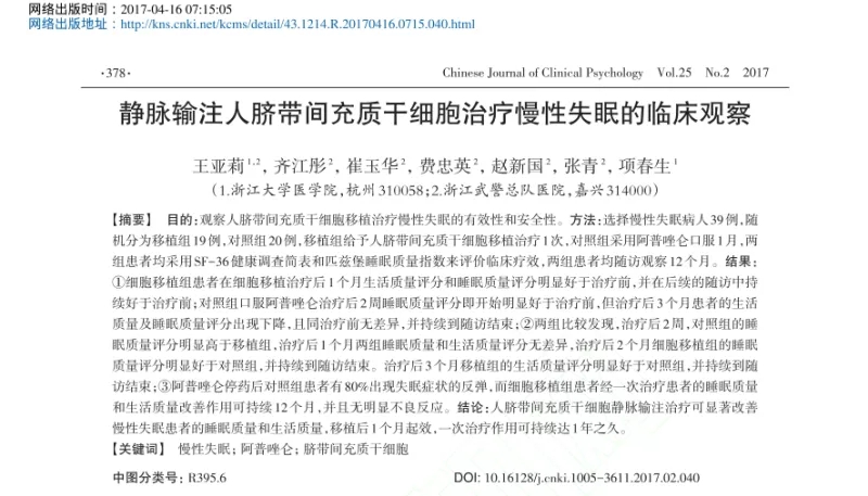 2017年,發(fā)表在《中國臨床心理學(xué)》雜志的一項臨床觀察成果顯示,靜脈輸注臍帶間充質(zhì)干細(xì)胞可長期改善慢性失眠患者的睡眠質(zhì)量。
