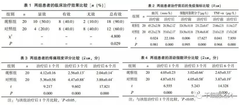 研究結(jié)果顯示,采用間充質(zhì)干細(xì)胞的類(lèi)風(fēng)濕性關(guān)節(jié)炎受試者,明顯緩解和減輕臨床癥狀,其顯效率、有效率均明顯高于對(duì)照組。