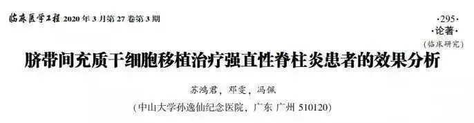2020年,一份臨床研究中選取中山大學(xué)孫逸仙紀(jì)念醫(yī)院2016年2月至2019年1月收治的40例強(qiáng)直性脊柱炎患者,隨機(jī)分為對(duì)照組和觀察組各20例。對(duì)照組采用免疫及生物制劑治療,觀察組采用臍帶間充質(zhì)干細(xì)胞移植治療,對(duì)比兩組的臨床治療效果,可觀察組治療總有效率高于對(duì)照組(P<0.05)。