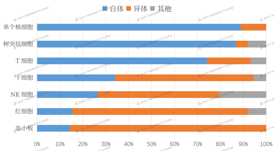 而在使用異體細(xì)胞的情況中,造血干細(xì)胞(61%)是因?yàn)橐浦餐ǔ>褪怯媒】导?xì)胞替換患者細(xì)胞,間充質(zhì)干細(xì)胞(65%)是因?yàn)楸旧砻庖咴缘?,NK 細(xì)胞(53%)是由于 KIR 錯(cuò)配的異體 NK 細(xì)胞既減少排斥,也能提高抗腫瘤作用。